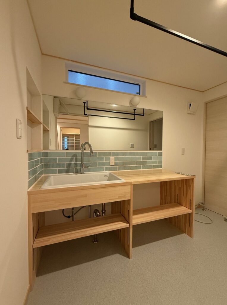 洗面所は脱衣室と分け、ご家族が並んで立てるよう鏡もワイドに設置。