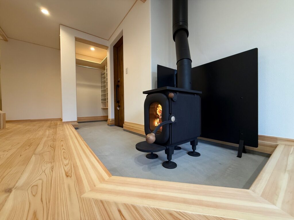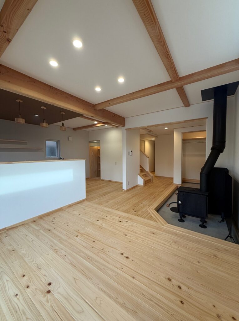 3世帯同居型のお住まいで、薪ストーブのある玄関ホール土間が特徴的です。