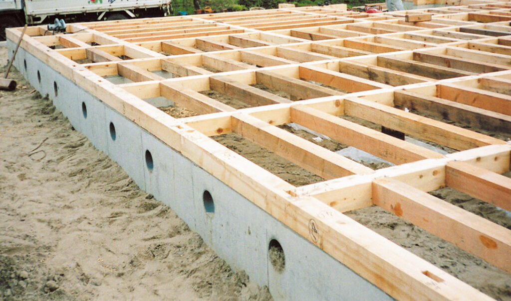 建物の壁面や柱下に逆T字型のコンクリート基礎を打つ工法で、弊社ではベタ基礎の前に標準としていた基礎です。コスト面で優れている反面、基礎が無いところは土が露出しますので、防湿対策をしっかりとしなくてはいけませんでした。例としては、防湿シートや防湿コンクリートで土面を覆うことがあげられます。