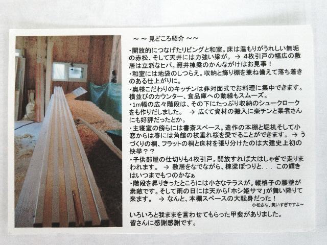 いよいよ今週末となりました「保戸野の家」完成内覧会ですが、 なんとお施主様ご自身から、今内覧会の見どころをお葉書にて頂戴いたしました! スタッフ一同、感激のあまり、無理をお願いしてブログにて内容をご紹介させていただくことになりましたのでぜひご覧ください!!お写真もお施主様ご自身で撮られています。 想いと情熱がビシビシ伝わるご案内をありがとうございます!!