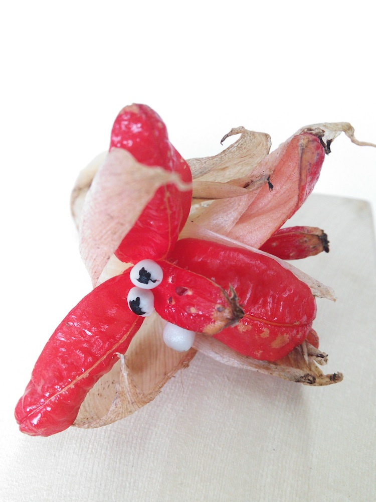 真っ赤で唐辛子みたいですね。黒いものが種です。なぜ赤いのか?はまだ解明されていないそうです。 なんか、セサミストリ−トのキャラクタ−みたいでとっても愛嬌がありますよね。 この色や形もなにか意味のあってのことだと思います。自然って不思議で本当に面白いですよね。