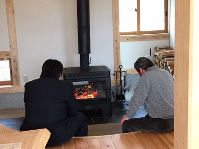 「大建の家」展示場の薪ストーブを囲んでの会長と社長のツーショット写真。