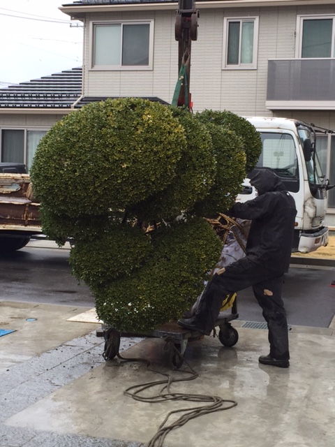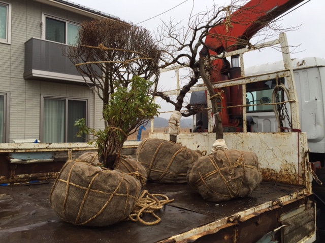 そんなお庭のお話の流れで、昨日取りかからせていただきました庭工事をご紹介いたします。 下の写真は移植作業の様子です。 お施主様のご実家(男鹿市)から思い入れのある樹木を選び、根巻きをし、庭石と石灯籠と一緒に秋田市の新居に移植いたしました。 根巻きをし、傷がつかないよう、そっとクレーンで持ち上げ移動します。この日はカーポートが途中にあったため台車で移動。 職人さんにはご難儀おかけいたしました。