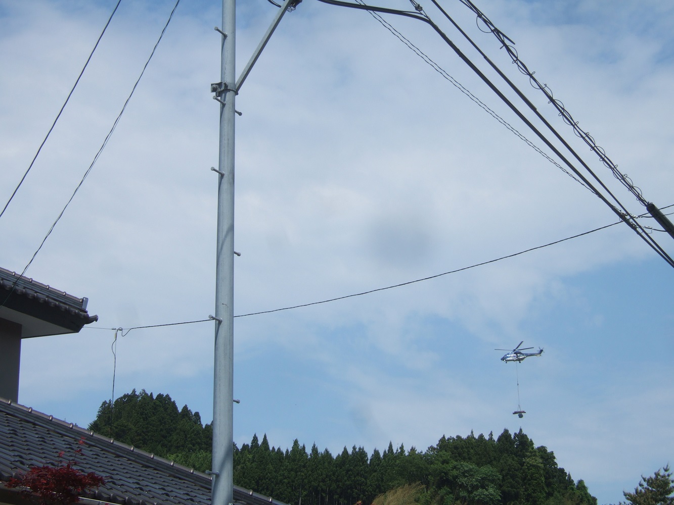 由利本荘市のM様邸の現場にて 高田棟梁が現場の室内で突然、 「何か焦げ臭ぐねっすか」と外の匂いを嗅ごうとしてました。 代わりに外に出てみたところ、近くの山上で高度を下げようとしているヘリコプターが、見れば何やら吊り下げている様子・・・ 脳裏には「山火事」の言葉と、福島原発でのヘリ放水の映像が浮かびます。 でも、私には焦げ臭いにおいも嗅げず、煙も見つけられません。 ヘリは山裾まで降下し、高齢者の施設へ着陸するようにも見えます。 (何だドクターヘリか・・・でも、色が違うし・・・・) 一瞬、手前の木々で見えなくなったヘリは、また高度を上げ東に向かって飛び去りました。 私の老眼には、吊り下げている物が何なのか?寝袋に包まれた人のようにも見え、橇のようにも見え・・・ そんな風にヘリコプターを見つけ大騒ぎしている私を他所に、大工さんと電気屋さんは一生懸命作業をしてくれてました。 先日もお施主様から現場の職人さんたちの真面目さが、近所でも評判になっているとのメールを頂戴しました。ありがとうございます。