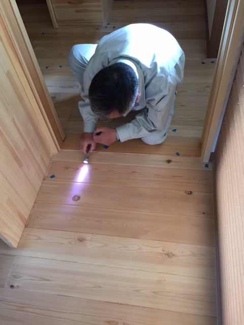 これは専務の最終チェックの様子です。 なんと、室内を暗くし、ペンライトで光を当て、影の有無で床材の凹凸やキズを見分けています。 恐ろしいくらいの徹底ぶり。鬼のチェック!すべての不具合を半日かけて洗い出します。 大工さんも現場監督もドキドキですね~。 その後、補修や調整をしっかりさせていただき、再度ハウスクリーニングをしてから、晴れてお引渡しとなります。 S様、内覧会ありがとうございました。お引渡しまでもう少しだけお待ちください。 |