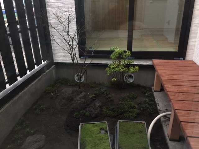 写真はお風呂場のFIX窓から撮った北側の坪庭です。樹木の配置(右:ナツハゼ 左:アセビ)とマウンドの高低・飛び石・景石の位置が決まりましたので、明日、苔はりと砂利をしきます。併せて玄関前のアプローチにシンボルツリーを植樹し、南側の庭にも手を加えます。