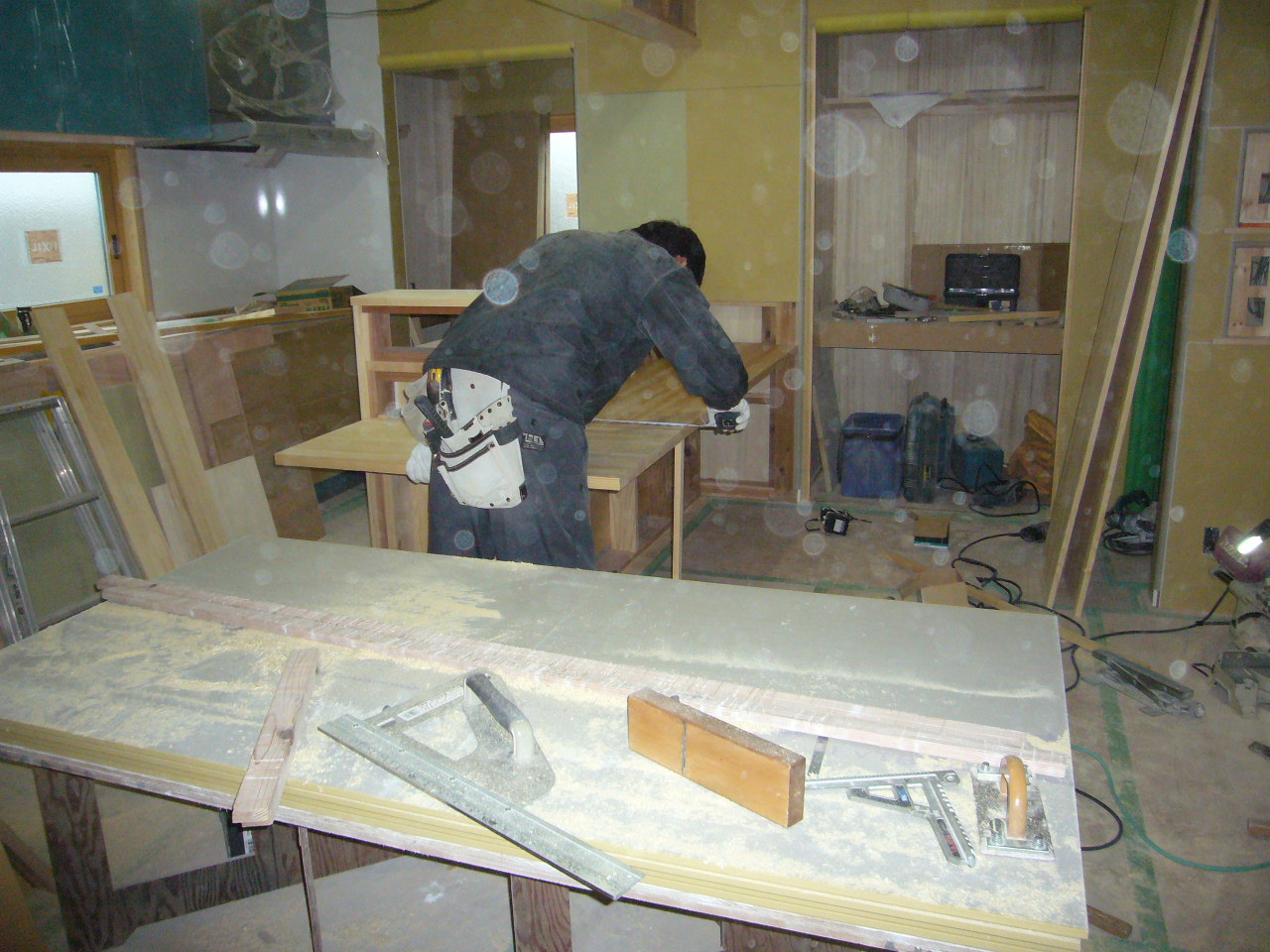 内部の大工仕事も大分終わり、今は造作家具を一生懸命に作ってます。