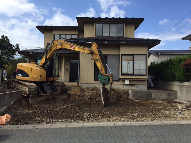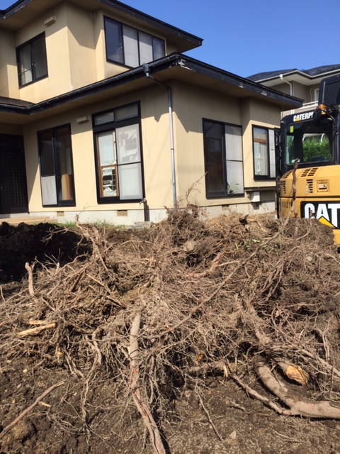 こんにちは、高橋です。 御所野で計画中のリノベ物件。 先日はインスペクションを実施。予想外に良い結果で、リノベの方針は現行案でまったく問題なし。 今日は樹木の根切りと駐車場スペースの拡張で重機を入れました。 出てきたコンクリートガラで整地までするという職人芸! 非常に繊細なお仕事で見ていて飽きません。 大量の根っこ! 放っておくとシロアリの温床にもなりますし、新たな植栽の邪魔にもなりますからしっかりと取り除きます。 あとで新しい土も入れ直します。