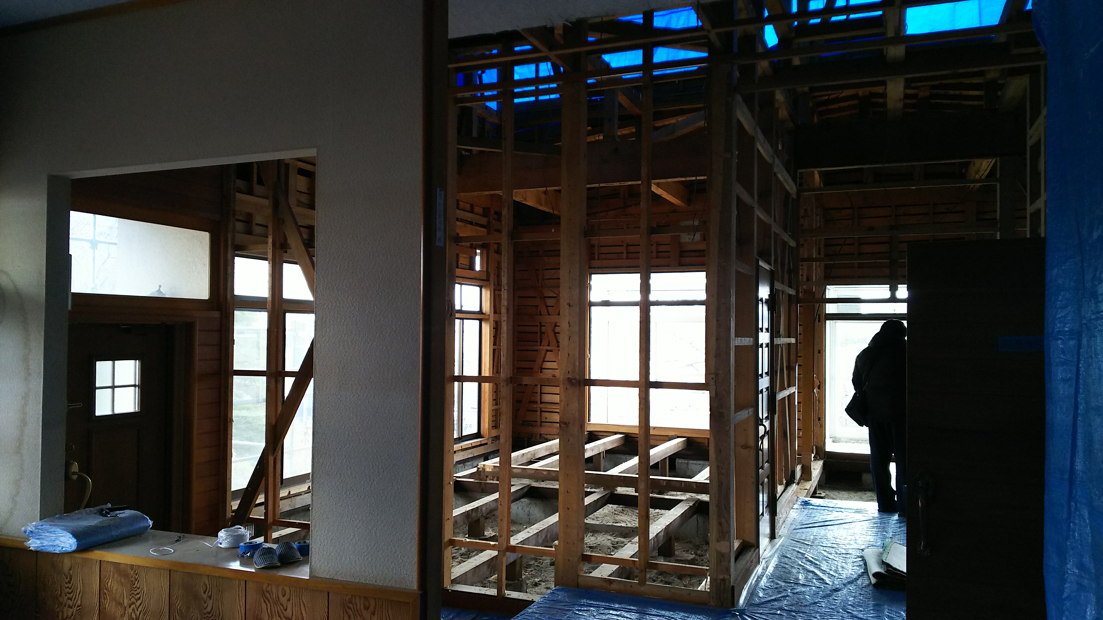 こんにちは、高橋です。 能代市でリノベーション工事が始まりました。 実は能代市では大建初のお仕事となります。 とっても大きくて立派なお宅です。 家族構成の変化から、不要になった2階部分を解体し、平屋に減築します。 内部の解体も進んでいます。(玄関ホールからリビング方向を見た写真) 養生をしっかりとし、既存の構造材を傷つけないよう丁寧に解体していきます。 来春完成予定ですので、進捗状況を今後もご紹介していきたいと思います。 ちなみに写真中のシルエットの人物は社長です。(抜き打ちで現場チェックに来ているところ) |