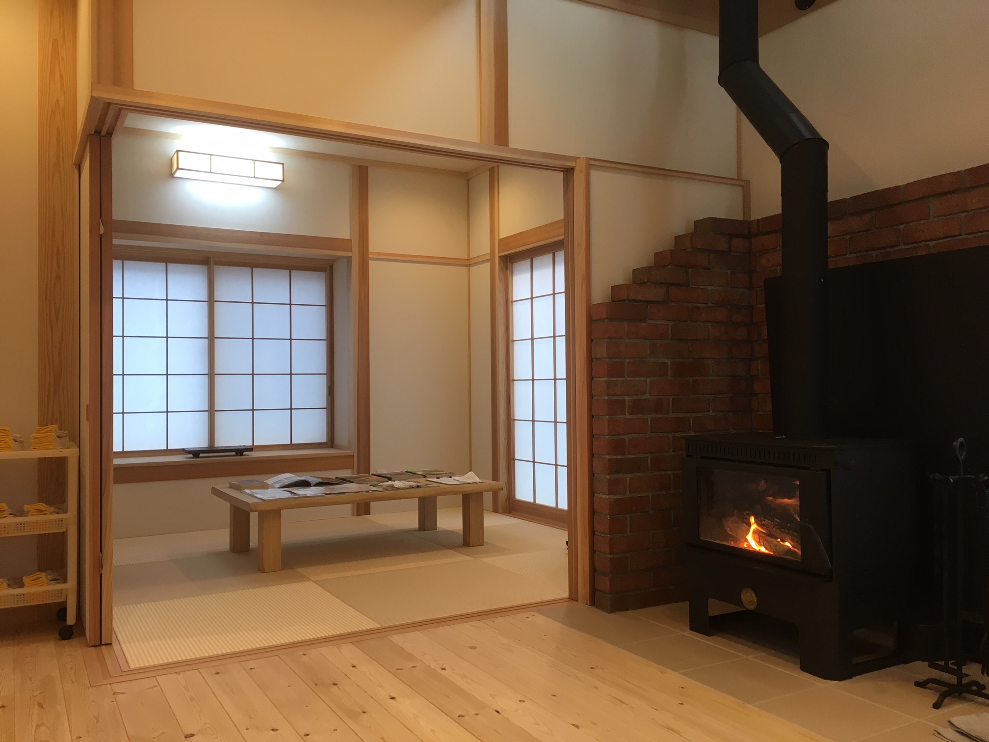 写真はリビングとつながった和室と薪ストーブ。