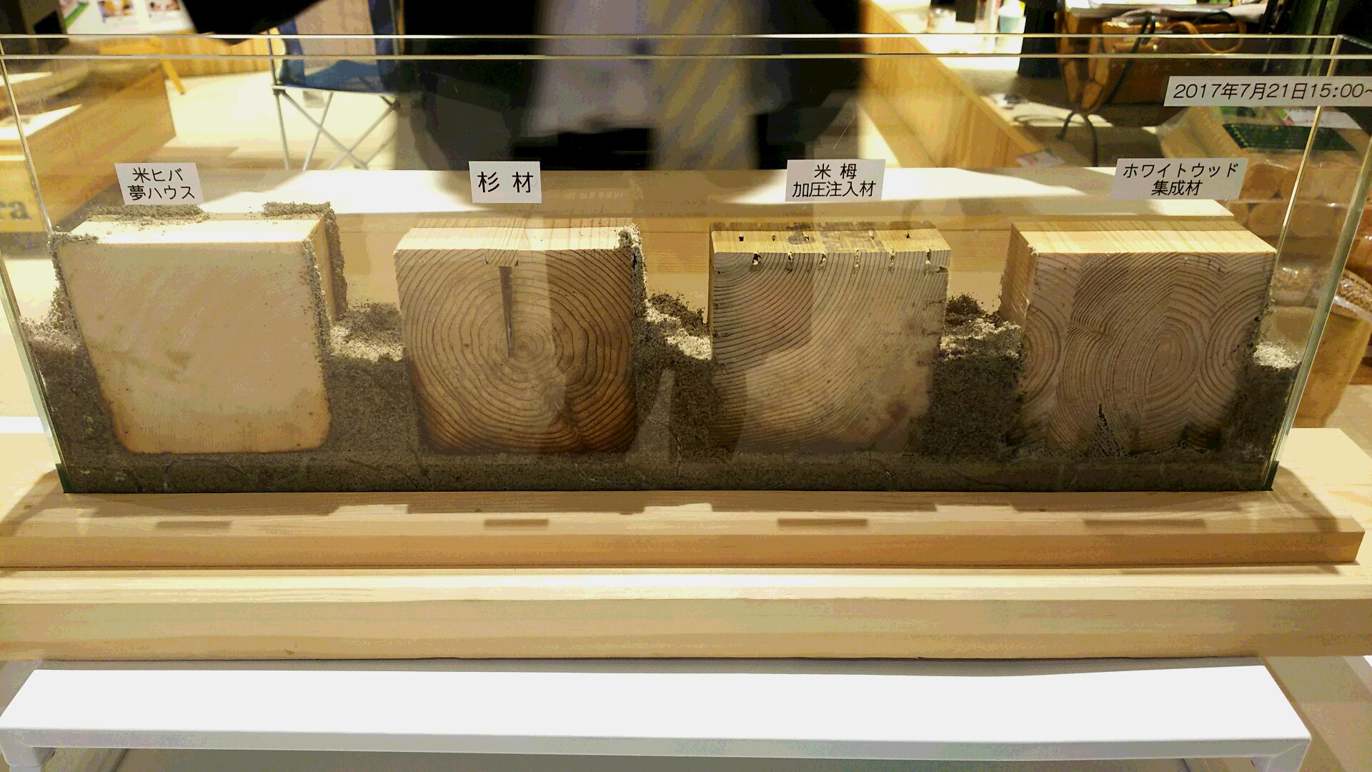 こんにちは、高橋です。 シロアリが実際に木をかじっている様子って見たことありますか? ほとんどの方が見たことが無いと思いますので、夢ハウスで実験してもらいました。 一番左が大建が土台に使用しているヒバです。 左からヒバ、杉、加圧注入材(土台)、集成材です。 ヒバの周りに出来ているのが蟻道と呼ばれるシロアリの通り道。湿度を保つためのトンネルのようなものです。 かじれるところが無いため、砂の上に蟻道をつくり、なんとかかじれる場所を探した跡が見られます。 一方、他の木材は砂に埋まっているところから食害が見られました。 加圧注入材も蟻道で上にあがる必要もなく、木の割れなどの隙間から侵入を許しています。 集成材はノリに沿って群がっていました。 同じ条件下で見ると結果は一目瞭然。 シロアリはコンクリート基礎の周りからも蟻道を作って上がってきますので、ベタ基礎や基礎断熱でも防げない場合があります。 やはり土台の素材自体のシロアリ対策や乾燥、湿気のこもりにくい環境整備が必要なのだと思われます。