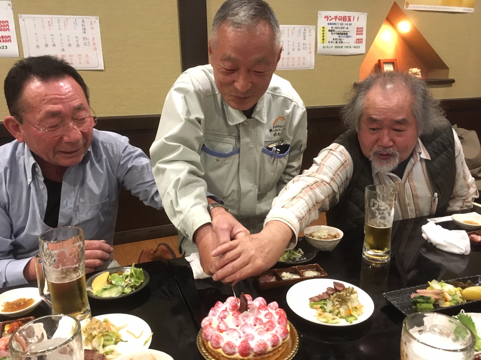 こんにちは、高橋です。 先日、社内で古希を迎えた御三方を皆でお祝いさせていただきました。 なぜかケーキ入刀。 わが社で一番元気のいい御三方。 同じく古希を迎えた事務長を含めて、わが社を支える強力な四本の矢です。 飲みの席での話題はプロ野球のお話し。 金農吉田君の話題も早々に、毎日オリオンズだとか、国鉄スワローズだとか、僕らが生れる前の野球ネタオンパレードで盛り上がりました。 この世代はホントお元気で頭が上がりません。 もう10年は現役で頑張ってもらいたいのでお体に気を付けて今後ともご指導よろしくお願いいたします!! |