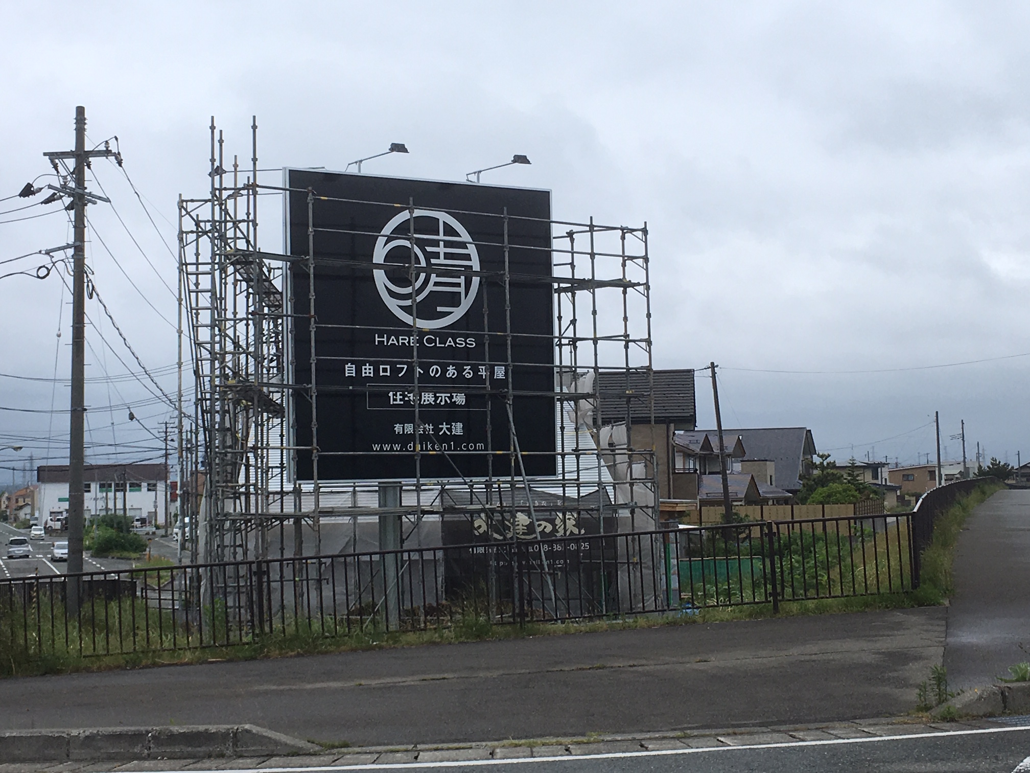 今日は看板が完成しました! でかい!そして目立つ!! 晴のロゴマークは「HARE CLASS」「晴れ暮らす。」の晴からデザインしています。 「HARE CLASS 晴れ暮らす。」とは大建オリジナルの平屋暮らしに特化した企画型プランのブランド名です。 もう2パターンの間取りプランも検討中ですのでお楽しみに!!