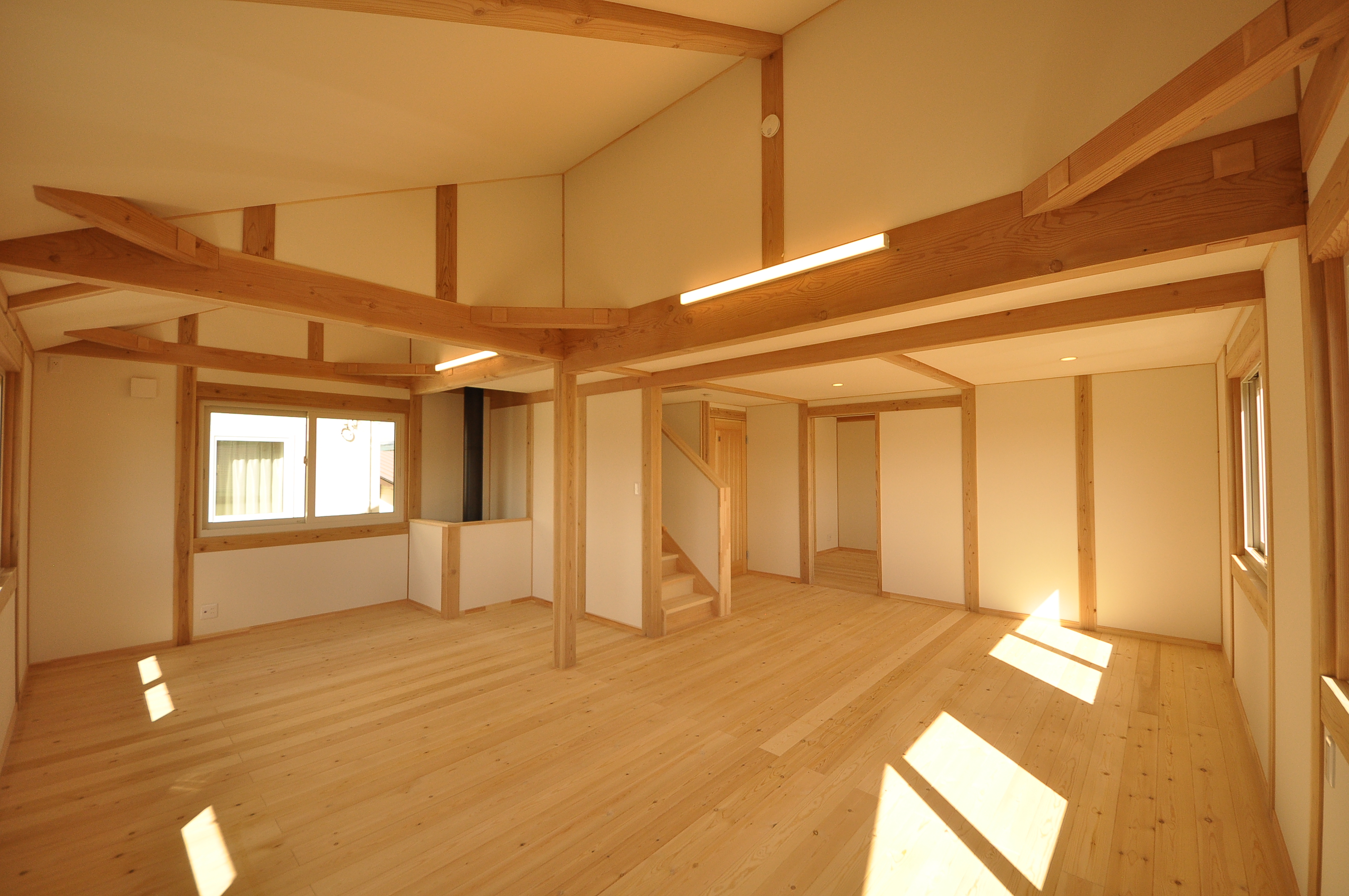 下の写真は2階子ども室とホールです。 走り回って過ごせるよう仕切りをなくしています。 (内覧会では走らないでくださいね。)