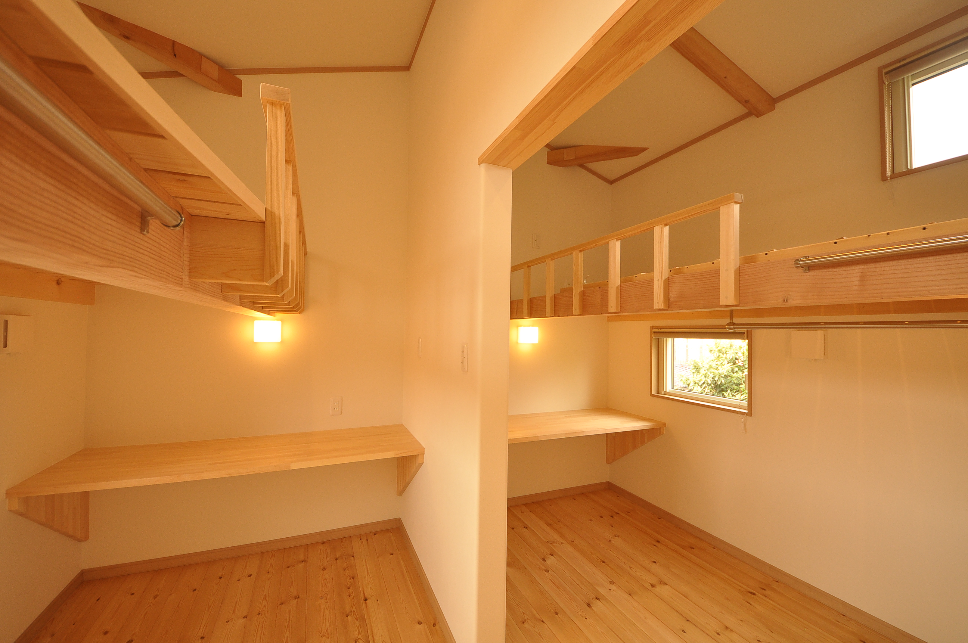 完全な個室にはせず、約3帖ほどの空間にロフトベッドとカウンター、ハンガーパイプを備え付けに。(弊社菅原考案) お引渡しの時に初めて見たお子様たちは大はしゃぎで気に入っていただきました! ロフトベッドって、なんか秘密基地っぽくてワクワクしますよね。 お子様のお部屋だからこそ、広さより楽しさにこだわるのはいかがでしょう?