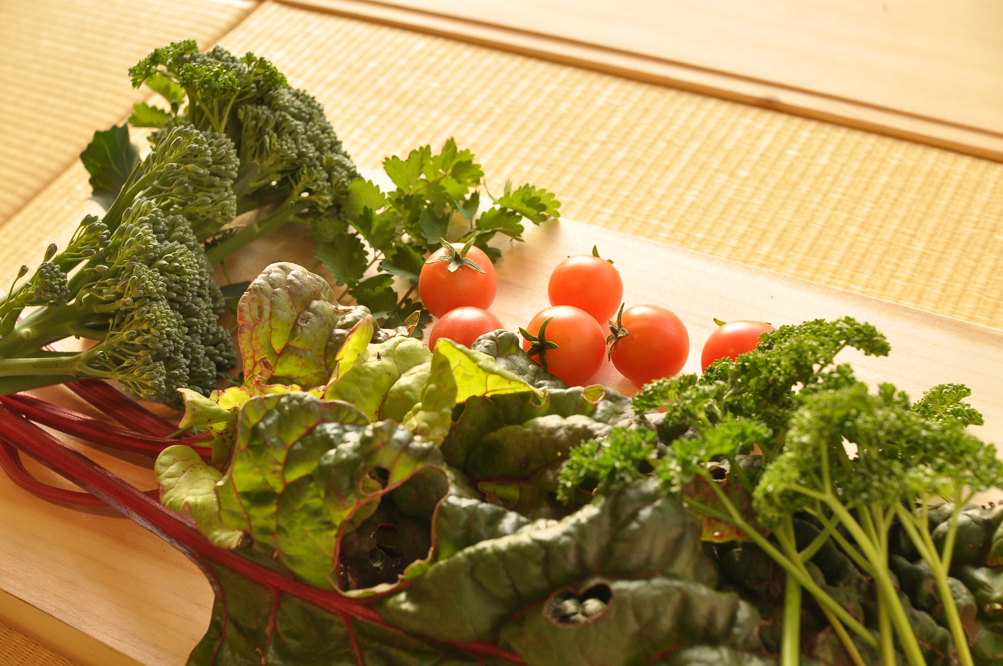 無農薬栽培なので、スイスチャードやブロッコリーの葉は青虫さんにところどころ食べられてます。