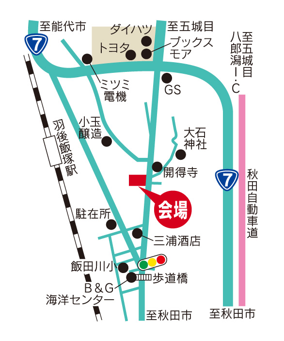 秋田市方面からは、7号線を進んでいただき、井川町のユニクロやまるまつさんなどがあるショッピングエリア(ブックスモアさんやトヨタさんもあります。)の手前の信号を左折して道なりにお進みください。