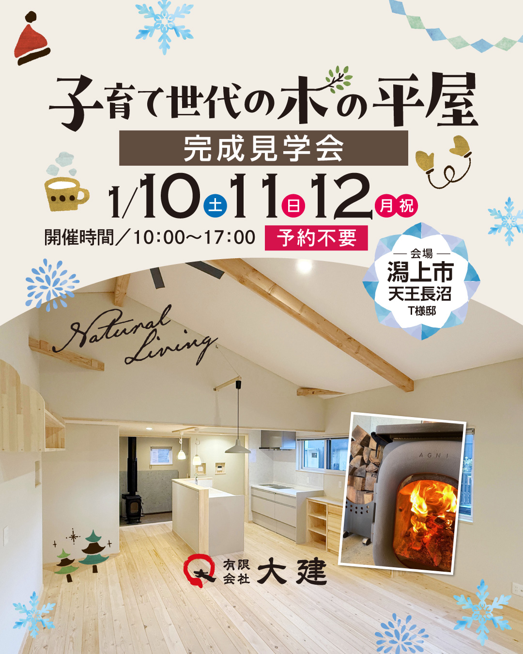 1/10・11・12 「子育て世代の木の平屋」 完成見学会のお知らせ
