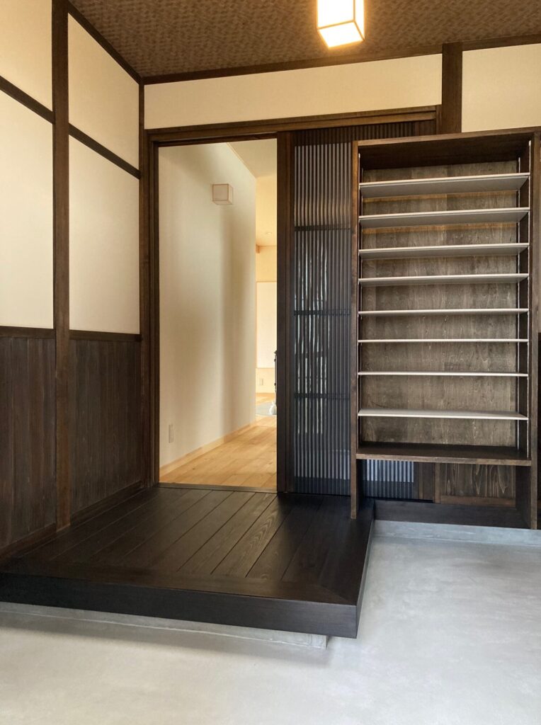 玄関を古民家風に仕上げたお住まい。床は赤松30㍉一枚板。使い込むにつれ味わいが増していきます。